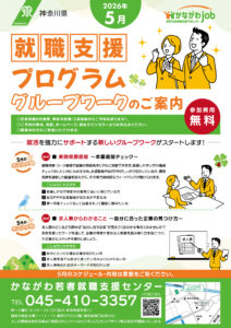 5月のグループワークのご案内 2026年04月21日 掲載 かながわ若者就職支援センターで開催する就職支援プログラム(グループワーク)のご案内を掲載しました。 5月のグループワーク 下記をクリックしてご覧ください(PDF形式) 現在予約可能なグループワーク Webからの予約はこちらをクリック